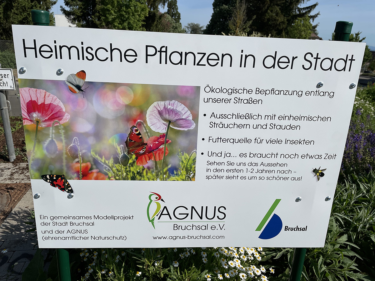 OB Petzold-Schick und die Stadtverwaltung stimmten 2020 einem Pilotprojekt zu. Am südlichen Ende der Weiherbergstraße, bei der alten Feuerwehrschule, gibt es eine Verkehrs"insel", die seit Jahrzehnten mit ödem Cotoneaster bepflanzt war. Ohne heimischen Baum und Strauch - einfach nur Bodendecker, einmal im Jahr auf Stock gesetzt. Im Zuge der Ertüchtigung der Entwässerung für das neue Baugebiet waren an dem Abwasserschacht, der sich dort befindet, größere Baumaßnahmen fällig, und die Bepflanzung wurde komplett entfernt. Die AGNUS machte daher den Vorschlag, ob es bei dieser Gelegenheit nicht an der Zeit wäre, diese Fläche sinnvoll zu nutzen und so naturnah wie möglich zu gestallten, um eine „Musterfläche” zu schaffen. Die AGNUS bot an, die Pflege der Fläche zu übernehmen und bei der Bepflanzung zu beraten. Anfang 2021 wurde zusammen mit der Stadt Bruchsal ein Plan ausgearbeitet, bei dem auch darauf geachtet wurde, dass die Pflanzen tatsächlich aus heimischen Beständen kommen. Deswegen wurden die Pflanzen durch die Stadt bei einer spezialisierten Gärtnerei im Südschwarzwald geordert (siehe auch die "Bruchsaler Gartenliste").