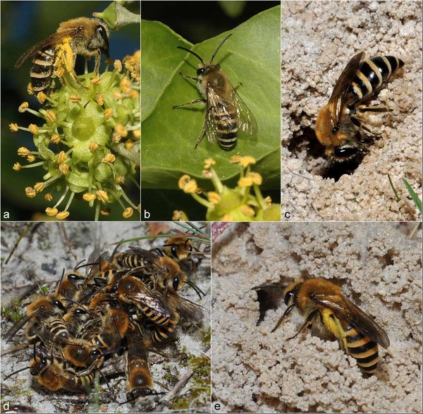 Entwicklungszyklus der Efeu-Seidenbiene: (a) Weibchen der Efeu-Seidenbiene beim Sammeln von Pollen an Efeu; (b) Männchen der Efeu-Seidenbienen suchen ebenfalls Efeu auf, um dort Nektar zu trinken oder um Weibchen zu treffen; (c) Weibchen gräbt ein Nest. Der Abraum wird rückwärtsgehend nach außen geschafft; (d) zeigt sich ein Weibchen, tauchen sofort zahlreiche Männchen auf, um ihre Paarungschancen zu nutzen. Dabei entstehen sogenannte "Paarungskugeln"; (e) ein Weibchen bringt Pollen in sein Nest, um die Brutkammern mit einem Pollen-Nektargemisch zu füllen, von dem sich die aus den dort abgelegten Eiern geschlüpften Bienenlarven ernähren (alle Bilder: H. Bahmer).